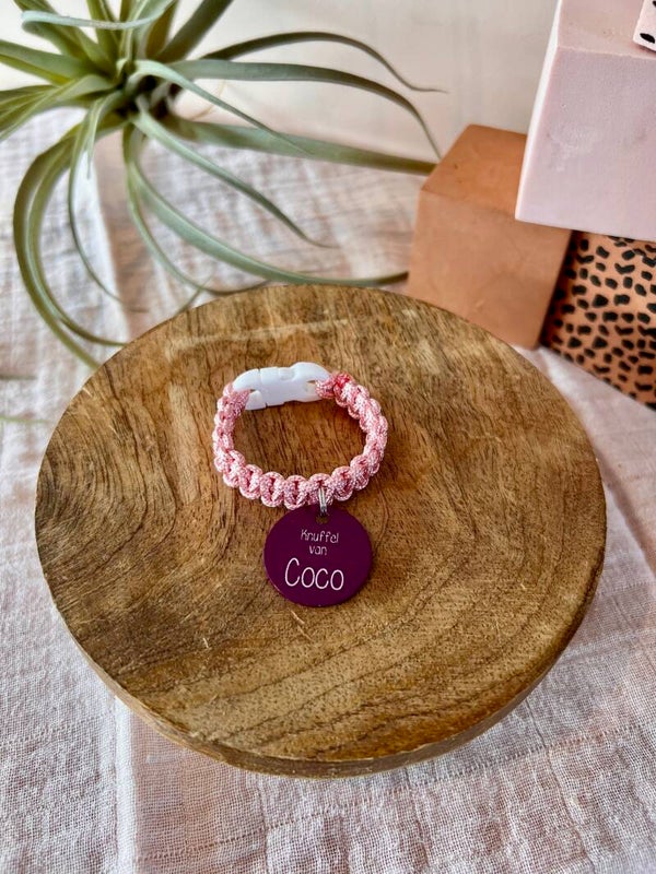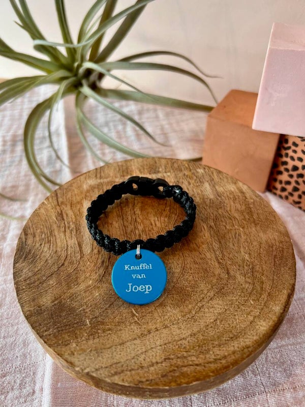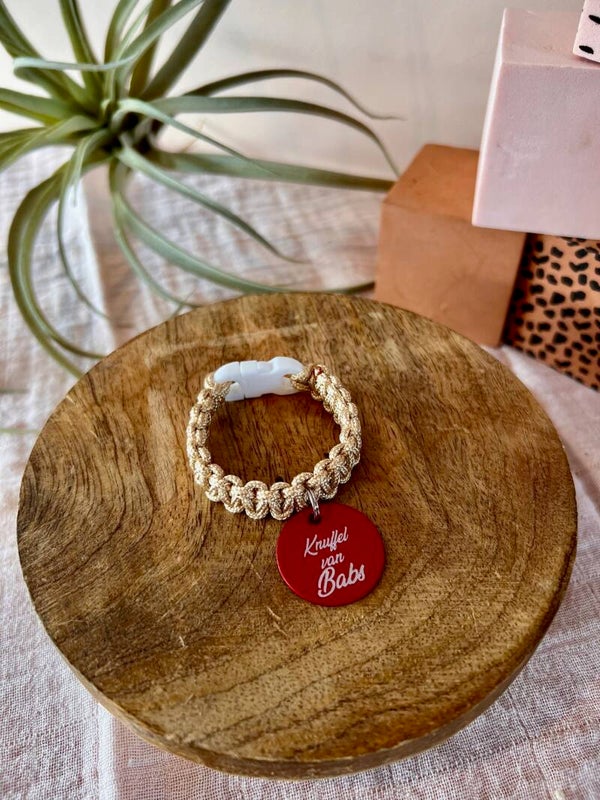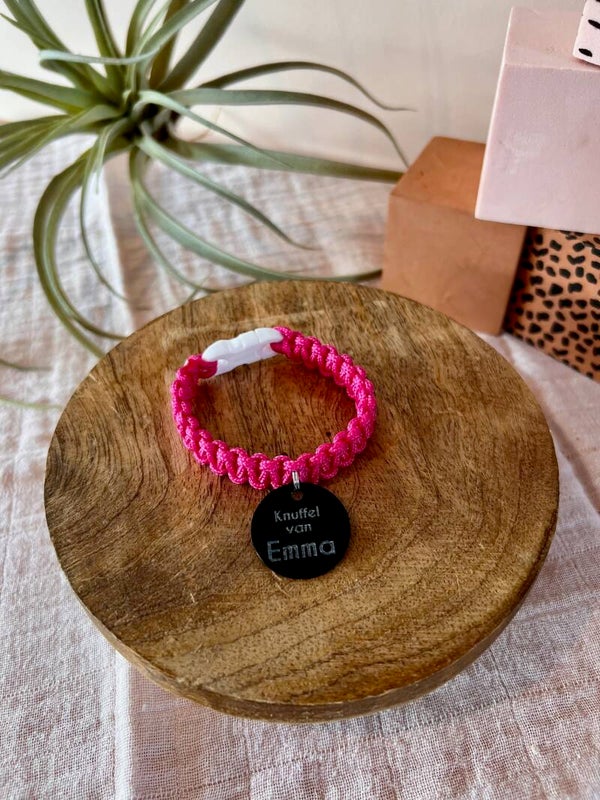 Handgemaakt knuffelbandje. Zo komt de pluche vriend van ieder kind na een avontuur weer veilig thuis.