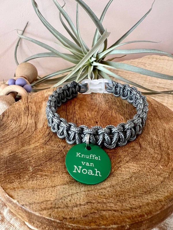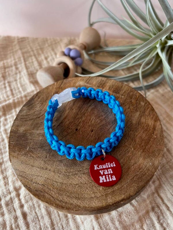 Handgemaakt knuffelbandje. Zo komt de pluche vriend van ieder kind na een avontuur weer veilig thuis.